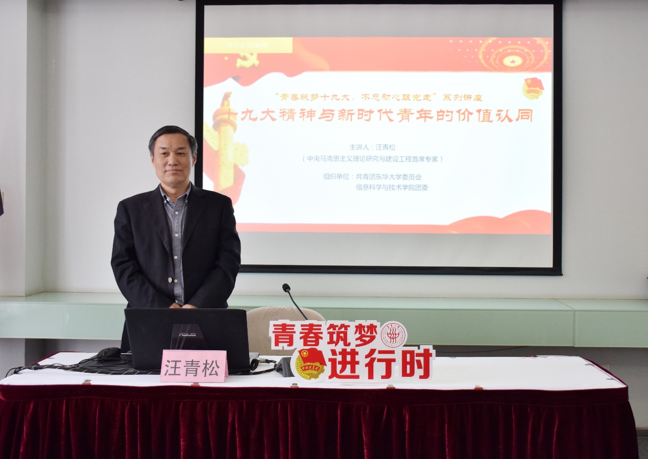 近日,中央马克思主义理论研究与建设工程首席专家汪青松做客我校第293期“周周讲”校园讲堂,为信息学院青年学子带来了一场题为《新时代中国共产党的新使命》的讲座,与大家分享交流学习党的十九大精神的体会。校团委副书记杨蓉、信息学院团委书记施政、信息学院团学骨干共同聆听了此次讲座。