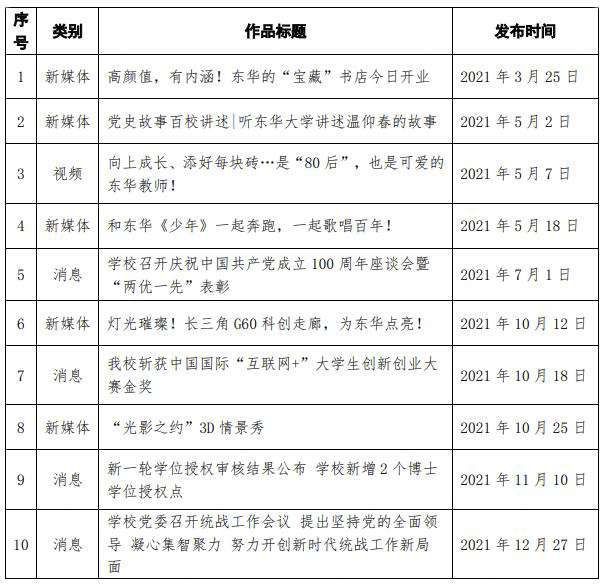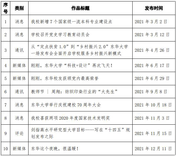 《学校召开党史学习教育动员会》《剑指高水平研究型大学目标——写在“十四五”规划发布之际》等10篇作品获评“2021年度校园好新闻”,《学校召开庆祝中国共产党成立100周年座谈会暨“两优一先”表彰》《新一轮学位授权审核结果公布 学校新增2个博士学位授权点》等10篇作品获评“2021年度校园好新闻提名”(获奖名单附后)。作品用新闻宣传记录东华人一年来的奋进足迹,传播好声音,凝聚正能量,背后凝结着全体东华师生的智慧与汗水。
